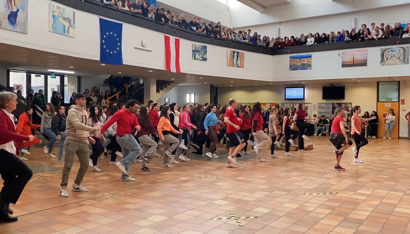 Am Weltfrauentag, dem 8.März, wurde in der Aula der Handelsakademie Baden ein Zeichen gegen Gewalt an Frauen gesetzt und mit viel Engagement zu „Break the Chain“ getanzt. Etwa 100 Mädchen, einige Burschen und Lehrerinnen und Lehrer beteiligten sich.